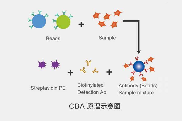 包被細胞因子特異性抗體的熒光磁性微球與待測樣本孵育,可與樣本中相應的細胞因子特異性結合,加入生物素標記的檢測抗體后,形成抗體包被微球-細胞因子-檢測抗體的免疫復合物;最后加入SAV-PE,通過流式細胞儀檢測,熒光強度與樣本中細胞因子的含量成正比,最后結合細胞因子標準品的標準曲線,從而實現(xiàn)對同一份樣本中細胞因子的定量檢測。